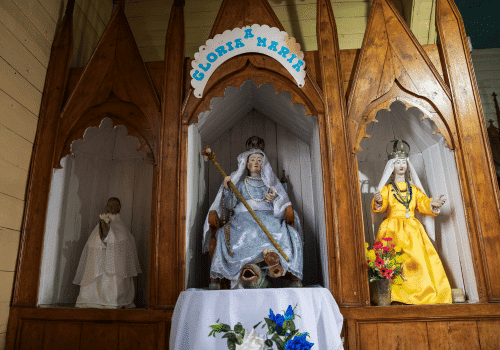 Entre las imágenes de la iglesia, destaca la ‘Virgen sentada», que representa a la Inmaculada Concepción en un trono de madera, pisando a un demonio en forma de serpiente. Esta imagen es única en el archipiélago y se asocia directamente con la localidad, dado que nombre mapudungún de Vilupulli, se traduce como’Loma de la culebra» o ‘Colina de la serpiente».